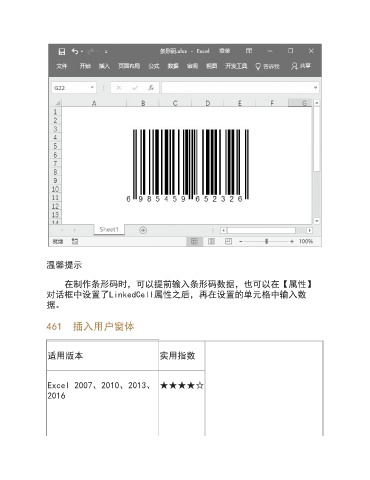 温馨提示 在制作条形码时,可以提前输入条形码数据,也可以在【属性】 对话框中设置了LinkedCell属性之后,再在设置的单元格中输入数 据。 461 插入用户窗体 适用版本 实用指数 Excel 2007、2010、2013、 ★★★★☆ 2016
