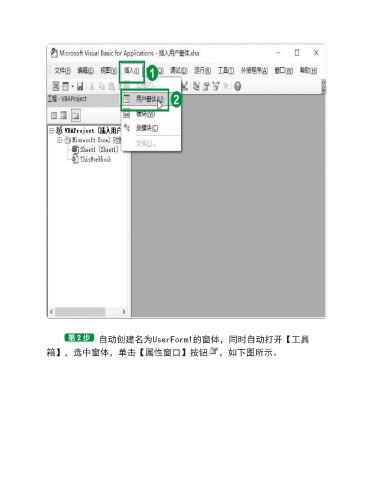 自动创建名为UserForm1的窗体,同时自动打开【工具 箱】,选中窗体,单击【属性窗口】按钮 ,如下图所示。