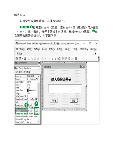 解决方法 如果要更改窗体背景,具体方法如下。 打开素材文件(位置:素材文件\第16章\插入用户窗体 1.xlsx),选中窗体,打开【属性】对话框,选择Picture属性; 在 右侧单击展开按钮 ,如下图所示。