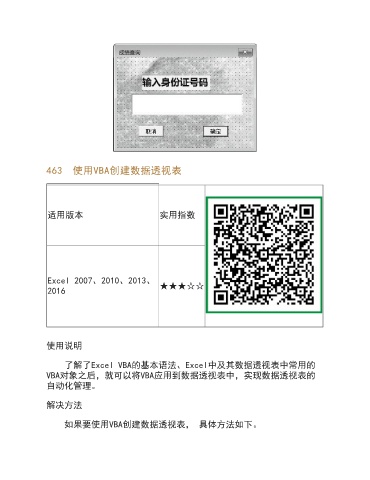 463 使用VBA创建数据透视表 适用版本 实用指数 Excel 2007、2010、2013、 2016 ★★★☆☆ 使用说明 了解了Excel VBA的基本语法、Excel中及其数据透视表中常用的 VBA对象之后,就可以将VBA应用到数据透视表中,实现数据透视表的 自动化管理。 解决方法 如果要使用VBA创建数据透视表, 具体方法如下。