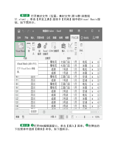 打开素材文件(位置:素材文件\第16章\销售统 计.xlsm),单击【开发工具】选项卡【代码】组中的Visual Basic按 钮,如下图所示。 打开VBA编辑器窗口,单击【插入】菜单; 在弹出的 下拉菜单中选择【模块】命令,如下图所示。