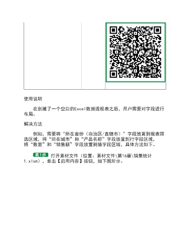 使用说明 在创建了一个空白的Excel数据透视表之后,用户需要对字段进行 布局。 解决方法 例如,需要将“所在省份(自治区/直辖市)”字段放置到报表筛 选区域,将“所在城市”和“产品名称”字段放置到行字段区域, 将“数量”和“销售额”字段放置到值字段区域,具体方法如下。 打开素材文件(位置:素材文件\第16章\销量统计 1.xlsm),单击【启用内容】按钮,如下图所示。