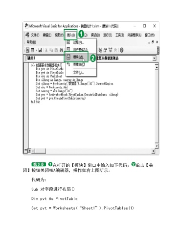 在打开的【模块】窗口中输入如下代码; 单击【关 闭】按钮关闭VBA编辑器,操作如右上图所示。 代码为: Sub 对字段进行布局() Dim pvt As PivotTable Set pvt = Worksheets(“Sheet1”).PivotTables(1)
