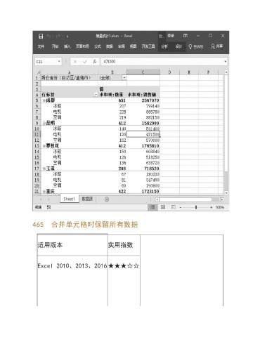 465 合并单元格时保留所有数据 适用版本 实用指数 Excel 2010、2013、2016★★★☆☆