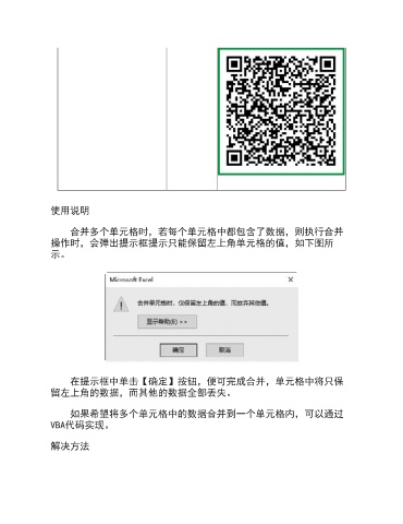 使用说明 合并多个单元格时,若每个单元格中都包含了数据,则执行合并 操作时,会弹出提示框提示只能保留左上角单元格的值,如下图所 示。 在提示框中单击【确定】按钮,便可完成合并,单元格中将只保 留左上角的数据,而其他的数据全部丢失。 如果希望将多个单元格中的数据合并到一个单元格内,可以通过 VBA代码实现。 解决方法