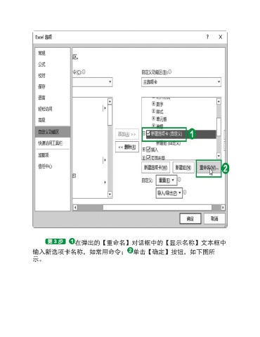在弹出的【重命名】对话框中的【显示名称】文本框中 输入新选项卡名称,如常用命令; 单击【确定】按钮,如下图所 示。