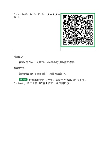 Excel 2007、2010、2013、 ★★★★☆ 2016 使用说明 在VBA窗口中,设置Visible属性可以隐藏工作表。 解决方法 如果想设置Visible属性,具体方法如下。 打开素材文件(位置:素材文件\第16章\销量统计 2.xlsm),单击【启用内容】按钮,如下图所示。