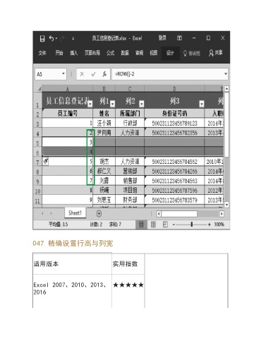 047 精确设置行高与列宽 适用版本 实用指数 Excel 2007、2010、2013、 ★★★★★ 2016