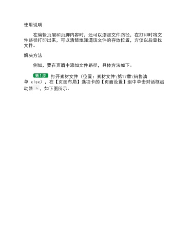 使用说明 在编辑页眉和页脚内容时,还可以添加文件路径,在打印时将文 件路径打印出来,可以清楚地知道该文件的存放位置,方便以后查找 文件。 解决方法 例如,要在页眉中添加文件路径,具体方法如下。 打开素材文件(位置:素材文件\第17章\销售清 单.xlsx),在【页面布局】选项卡的【页面设置】组中单击对话框启 动器 ,如下图所示。