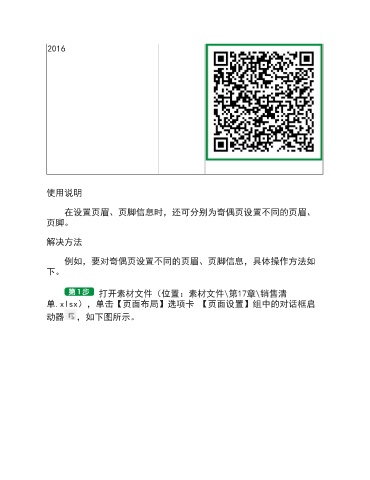 2016 使用说明 在设置页眉、页脚信息时,还可分别为奇偶页设置不同的页眉、 页脚。 解决方法 例如,要对奇偶页设置不同的页眉、页脚信息,具体操作方法如 下。 打开素材文件(位置:素材文件\第17章\销售清 单.xlsx),单击【页面布局】选项卡 【页面设置】组中的对话框启 动器 ,如下图所示。
