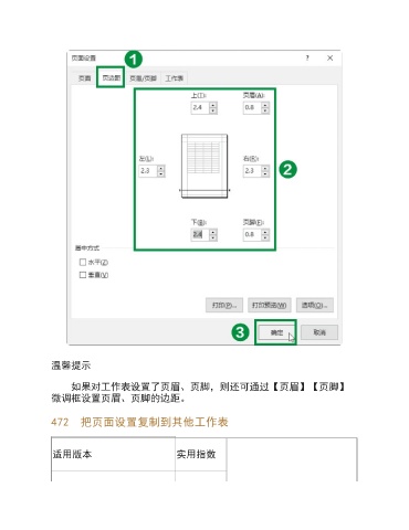 温馨提示 如果对工作表设置了页眉、页脚,则还可通过【页眉】【页脚】 微调框设置页眉、页脚的边距。 472 把页面设置复制到其他工作表 适用版本 实用指数