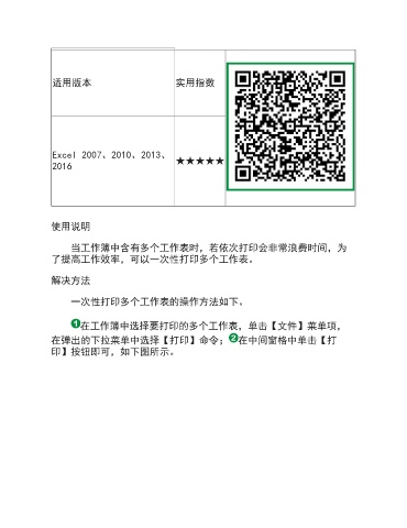 适用版本 实用指数 Excel 2007、2010、2013、 2016 ★★★★★ 使用说明 当工作簿中含有多个工作表时,若依次打印会非常浪费时间,为 了提高工作效率,可以一次性打印多个工作表。 解决方法 一次性打印多个工作表的操作方法如下。 在工作簿中选择要打印的多个工作表,单击【文件】菜单项, 在弹出的下拉菜单中选择【打印】命令; 在中间窗格中单击【打 印】按钮即可,如下图所示。