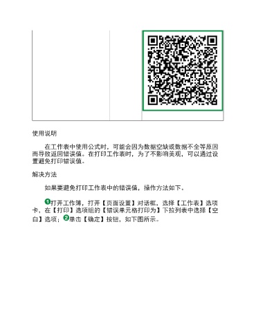 使用说明 在工作表中使用公式时,可能会因为数据空缺或数据不全等原因 而导致返回错误值。在打印工作表时,为了不影响美观,可以通过设 置避免打印错误值。 解决方法 如果要避免打印工作表中的错误值,操作方法如下。 打开工作簿,打开【页面设置】对话框,选择【工作表】选项 卡,在【打印】选项组的【错误单元格打印为】下拉列表中选择【空 白】选项; 单击【确定】按钮,如下图所示。