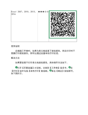 Excel 2007、2010、2013、 ★★★☆☆ 2016 使用说明 在编辑工作表时,如果为单元格设置了底纹颜色,而在打印时不 需要打印底纹颜色,则可以通过设置单色打印实现。 解决方法 如果要设置不打印单元格底纹颜色,具体操作方法如下。 打开【页面设置】对话框,切换到【工作表】选项卡; 在 【打印】组中勾选【单色打印】复选框; 单击【确定】按钮即可, 如下图所示。