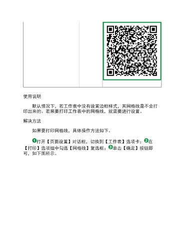 使用说明 默认情况下,若工作表中没有设置边框样式,其网格线是不会打 印出来的。若果要打印工作表中的网格线,就需要进行设置。 解决方法 如果要打印网格线,具体操作方法如下。 打开【页面设置】对话框,切换到【工作表】选项卡; 在 【打印】选项组中勾选【网格线】复选框; 单击【确定】按钮即 可,如下图所示。