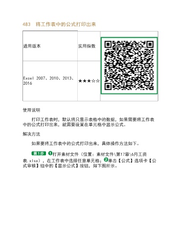 483 将工作表中的公式打印出来 适用版本 实用指数 Excel 2007、2010、2013、 2016 ★★★☆☆ 使用说明 打印工作表时,默认将只显示表格中的数据,如果需要将工作表 中的公式打印出来,就需要设置在单元格中显示公式。 解决方法 如果要将工作表中的公式打印出来,具体操作方法如下。 打开素材文件(位置:素材文件\第17章\6月工资 表.xlsx),在工作表中选择任意单元格; 单击【公式】选项卡【公 式审核】组中的【显示公式】按钮,如下图所示。