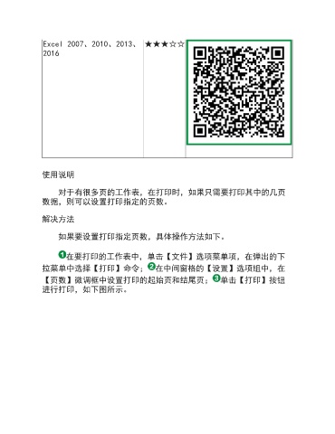 Excel 2007、2010、2013、 ★★★☆☆ 2016 使用说明 对于有很多页的工作表,在打印时,如果只需要打印其中的几页 数据,则可以设置打印指定的页数。 解决方法 如果要设置打印指定页数,具体操作方法如下。 在要打印的工作表中,单击【文件】选项菜单项,在弹出的下 拉菜单中选择【打印】命令; 在中间窗格的【设置】选项组中,在 【页数】微调框中设置打印的起始页和结尾页; 单击【打印】按钮 进行打印,如下图所示。