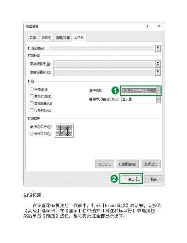 知识拓展 在设置带有批注的工作表中,打开【Excel选项】对话框,切换到 【高级】选项卡,在【显示】栏中选择【批注和标识符】单选按钮, 然后单击【确定】按钮,也可将批注全部显示出来。
