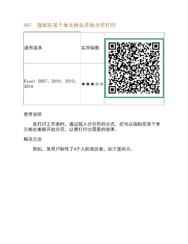 487 强制在某个单元格处开始分页打印 适用版本 实用指数 Excel 2007、2010、2013、 2016 ★★★☆☆ 使用说明 在打印工作表时,通过插入分页符的方式,还可以强制在某个单 元格处重新开始分页,以便打印出需要的效果。 解决方法 例如,某用户制作了4个人的简历表,如下图所示。