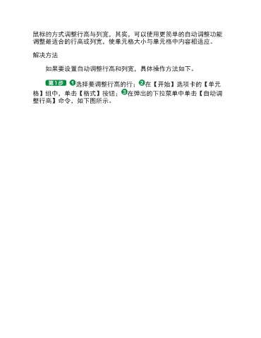 鼠标的方式调整行高与列宽,其实,可以使用更简单的自动调整功能 调整最适合的行高或列宽,使单元格大小与单元格中内容相适应。 解决方法 如果要设置自动调整行高和列宽,具体操作方法如下。 选择要调整行高的行; 在【开始】选项卡的【单元 格】组中,单击【格式】按钮; 在弹出的下拉菜单中单击【自动调 整行高】命令,如下图所示。