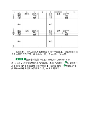在打印时,4个人的简历表都挤在了同一个页面上,现在希望将每 个人的简历分开打印,每人各占一页,具体操作方法如下。 打开素材文件(位置:素材文件\第17章\简历 表.xlsx),选中要分页的单元格位置,本例中选择E5; 在【页面布 局】选项卡的【页面设置】组中单击【分隔符】按钮; 在弹出的下 拉列表中选择【插入分页符】选项,如右上图所示。