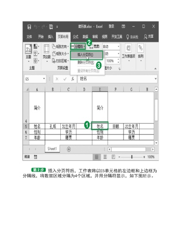 插入分页符后,工作表将以E5单元格的左边框和上边框为 分隔线,将数据区域分隔为4个区域,并用分隔符显示,如下图所示。
