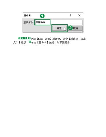 返回【Excel选项】对话框,选中【新建组(自定 义)】选项; 单击【重命名】按钮,如下图所示。
