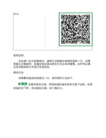 2016 使用说明 在处理一些大型表格时,通常汇总数据在表格的最后一行,当要 查看汇总数据时,若通过拖动滚动条的方式会非常缓慢,此时可以通 过双击鼠标的方式进行快速定位。 解决方法 如果要快速定位到最后一行,具体操作方法如下。 选择任意单元格,将鼠标指针指向该单元格下边框,待鼠 标指针呈 时,双击鼠标左键,如下图所示。
