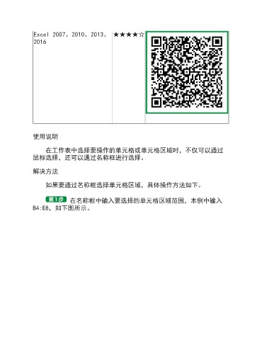 Excel 2007、2010、2013、 ★★★★☆ 2016 使用说明 在工作表中选择要操作的单元格或单元格区域时,不仅可以通过 鼠标选择,还可以通过名称框进行选择。 解决方法 如果要通过名称框选择单元格区域,具体操作方法如下。 在名称框中输入要选择的单元格区域范围,本例中输入 B4:E8,如下图所示。