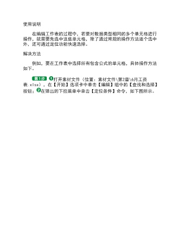 使用说明 在编辑工作表的过程中,若要对数据类型相同的多个单元格进行 操作,就需要先选中这些单元格,除了通过常规的操作方法逐个选中 外,还可通过定位功能快速选择。 解决方法 例如,要在工作表中选择所有包含公式的单元格,具体操作方法 如下。 打开素材文件(位置:素材文件\第2章\6月工资 表.xlsx),在【开始】选项卡中单击【编辑】组中的【查找和选择】 按钮; 在弹出的下拉菜单中单击【定位条件】命令,如下图所示。