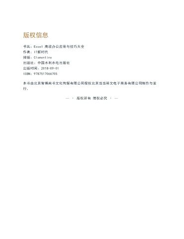版权信息 书名:Excel 高效办公应用与技巧大全 作者:IT新时代 排版:Clementine 出版社:中国水利水电出版社 出版时间:2018-09-01 ISBN:9787517066705 本书由北京智博尚书文化传媒有限公司授权北京当当科文电子商务有限公司制作与发 行。 — · 版权所有 侵权必究 · —