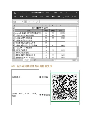 056 合并两列数据并自动删除重复值 适用版本 实用指数 Excel 2007、2010、2013、 2016 ★★★★☆