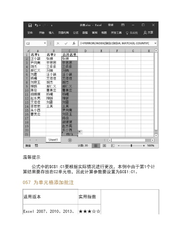 温馨提示 公式中的$C$1:C1要根据实际情况进行更改,本例中由于第1个计 算结果要存放在C2单元格,因此计算参数要设置为$C$1:C1。 057 为单元格添加批注 适用版本 实用指数 Excel 2007、2010、2013、 ★★★☆☆