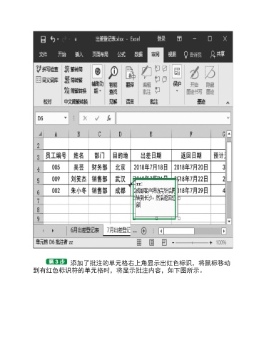 添加了批注的单元格右上角显示出红色标识,将鼠标移动 到有红色标识符的单元格时,将显示批注内容,如下图所示。