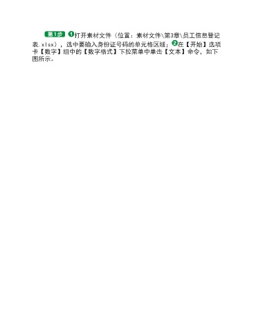 打开素材文件(位置:素材文件\第3章\员工信息登记 表.xlsx),选中要输入身份证号码的单元格区域; 在【开始】选项 卡【数字】组中的【数字格式】下拉菜单中单击【文本】命令,如下 图所示。