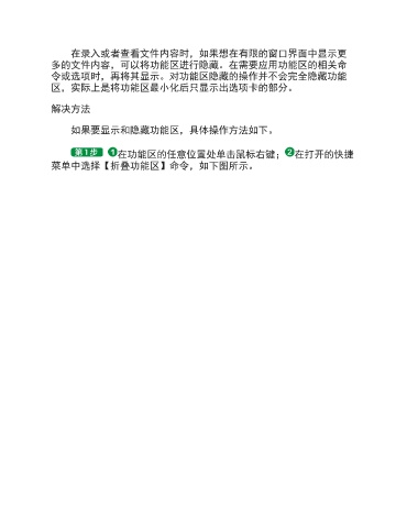 在录入或者查看文件内容时,如果想在有限的窗口界面中显示更 多的文件内容,可以将功能区进行隐藏。在需要应用功能区的相关命 令或选项时,再将其显示。对功能区隐藏的操作并不会完全隐藏功能 区,实际上是将功能区最小化后只显示出选项卡的部分。 解决方法 如果要显示和隐藏功能区,具体操作方法如下。 在功能区的任意位置处单击鼠标右键; 在打开的快捷 菜单中选择【折叠功能区】命令,如下图所示。
