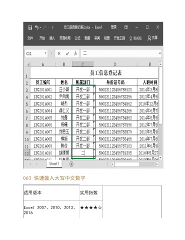 063 快速输入大写中文数字 适用版本 实用指数 Excel 2007、2010、2013、 ★★★★☆ 2016