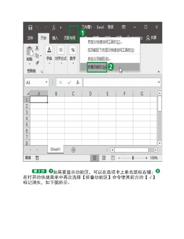 如果要显示功能区,可以在选项卡上单击鼠标右键; 在打开的快捷菜单中再次选择【折叠功能区】命令使其前方的【√】 标记消失,如下图所示。