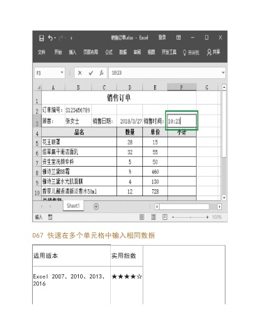 067 快速在多个单元格中输入相同数据 适用版本 实用指数 Excel 2007、2010、2013、 ★★★★☆ 2016