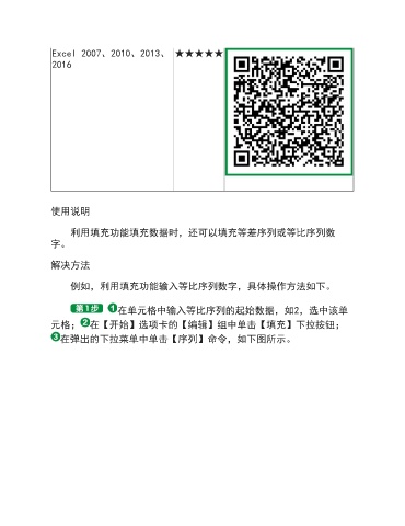 Excel 2007、2010、2013、 ★★★★★ 2016 使用说明 利用填充功能填充数据时,还可以填充等差序列或等比序列数 字。 解决方法 例如,利用填充功能输入等比序列数字,具体操作方法如下。 在单元格中输入等比序列的起始数据,如2,选中该单 元格; 在【开始】选项卡的【编辑】组中单击【填充】下拉按钮; 在弹出的下拉菜单中单击【序列】命令,如下图所示。