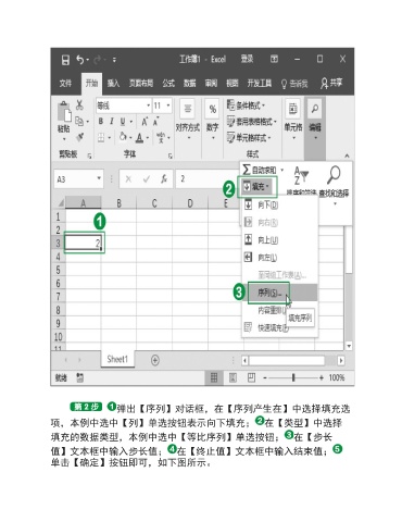 弹出【序列】对话框,在【序列产生在】中选择填充选 项,本例中选中【列】单选按钮表示向下填充; 在【类型】中选择 填充的数据类型,本例中选中【等比序列】单选按钮; 在【步长 值】文本框中输入步长值; 在【终止值】文本框中输入结束值; 单击【确定】按钮即可,如下图所示。