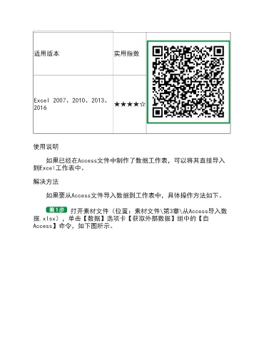 适用版本 实用指数 Excel 2007、2010、2013、 2016 ★★★★☆ 使用说明 如果已经在Access文件中制作了数据工作表,可以将其直接导入 到Excel工作表中。 解决方法 如果要从Access文件导入数据到工作表中,具体操作方法如下。 打开素材文件(位置:素材文件\第3章\从Access导入数 据.xlsx),单击【数据】选项卡【获取外部数据】组中的【自 Access】命令,如下图所示。