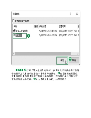 打开【导入数据】对话框,在【请选择该数据在工作簿 中的显示方式】选项组中选中【表】单选按钮; 在【数据的放置位 置】选项组中选择【现有工作表】单选按钮,并选择A1单元格作为放 置数据的起始单元格; 单击【确定】按钮,如下图所示。