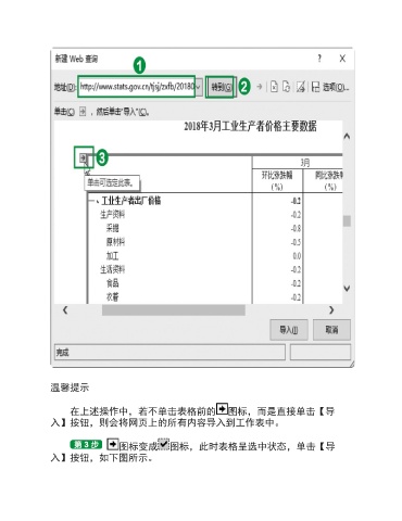 温馨提示 在上述操作中,若不单击表格前的 图标,而是直接单击【导 入】按钮,则会将网页上的所有内容导入到工作表中。 图标变成 图标,此时表格呈选中状态,单击【导 入】按钮,如下图所示。