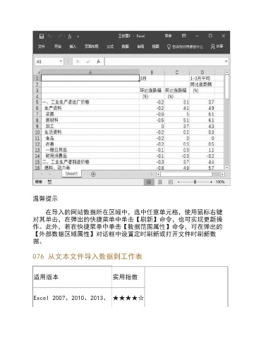 温馨提示 在导入的网站数据所在区域中,选中任意单元格,使用鼠标右键 对其单击,在弹出的快捷菜单中单击【刷新】命令,也可实现更新操 作。此外,若在快捷菜单中单击【数据范围属性】命令,可在弹出的 【外部数据区域属性】对话框中设置定时刷新或打开文件时刷新数 据。 076 从文本文件导入数据到工作表 适用版本 实用指数 Excel 2007、2010、2013、 ★★★★☆