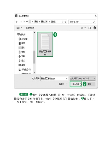 弹出【文本导入向导-第1步,共3步】对话框,【请选 择最合适的文件类型】栏中选中【分隔符号】单选按钮; 单击【下 一步】按钮,如下图所示。