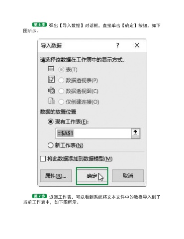 弹出【导入数据】对话框,直接单击【确定】按钮,如下 图所示。 返回工作表,可以看到系统将文本文件中的数据导入到了 当前工作表中,如下图所示。