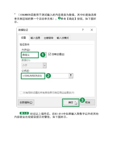 ”(ISNUMBER函数用于测试输入的内容是否为数值,其中B3是指选择 单元格区域的第一个活动单元格); 单击【确定】按钮,如下图所 示。 经过以上操作后,在B3:B14中如果输入除数字以外的其他 内容就会出现错误提示的警告,如下图所示。