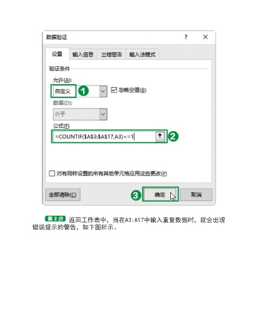 返回工作表中,当在A3:A17中输入重复数据时,就会出现 错误提示的警告,如下图所示。