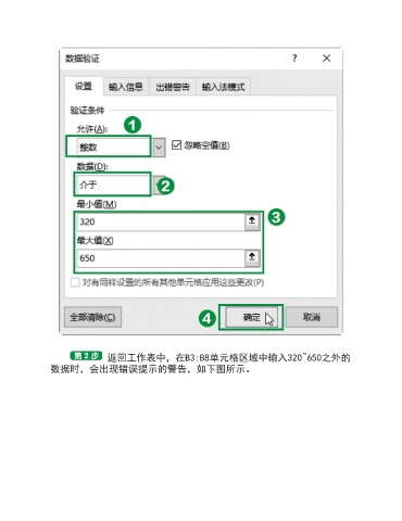 返回工作表中,在B3:B8单元格区域中输入320~650之外的 数据时,会出现错误提示的警告,如下图所示。
